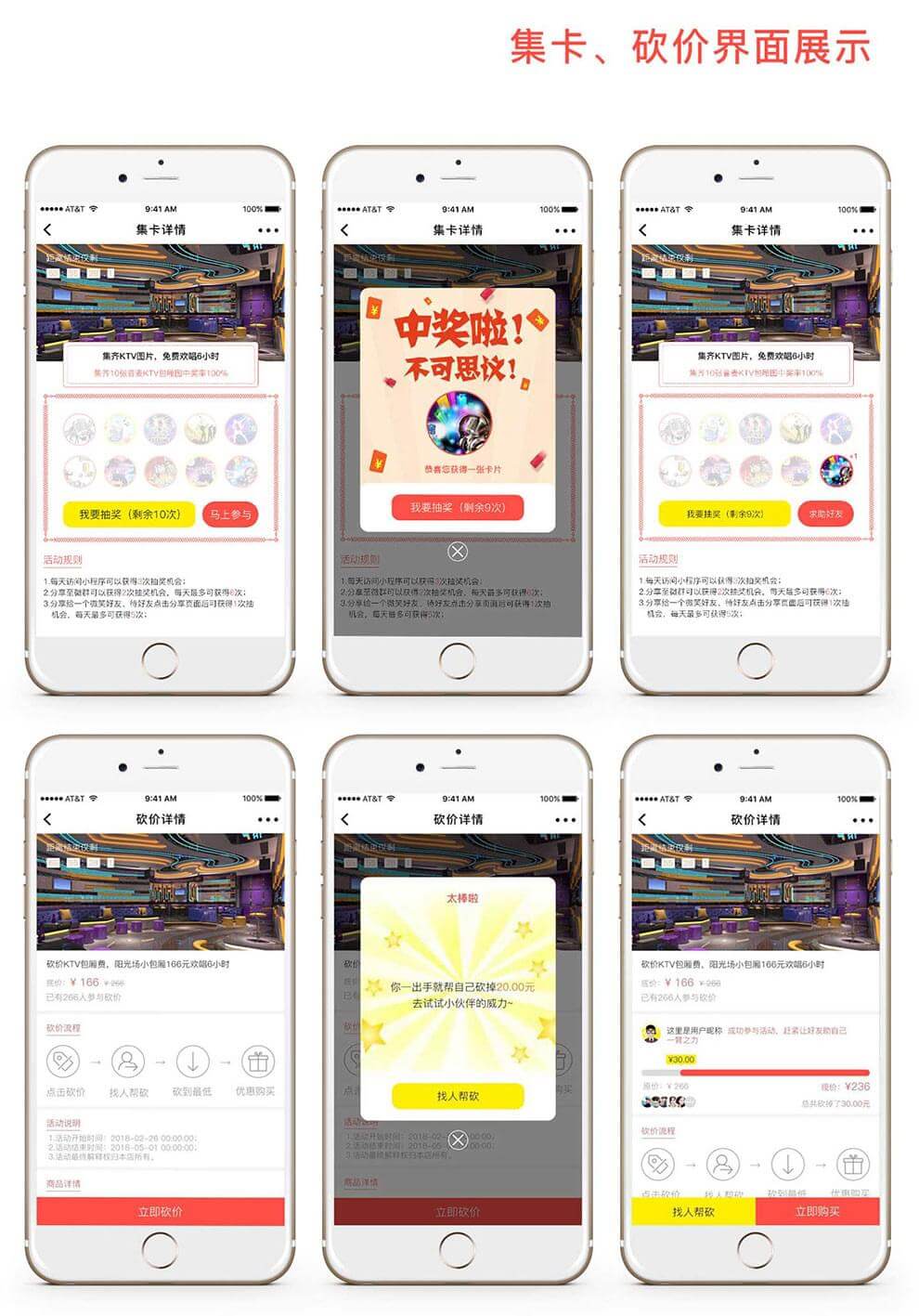 KTV微信小程序支持砍价、集卡、预约,商城。可预订任何包厢、酒水零食,所消费的总额可获得积分,积分兑换礼品,用户自定义;可以查看歌友发布的K歌信息,喜欢,评论,发布,互动交流...... 当前版本为连锁店版(商家手机端后台、店长手机端后台、服务生手机端后台)!